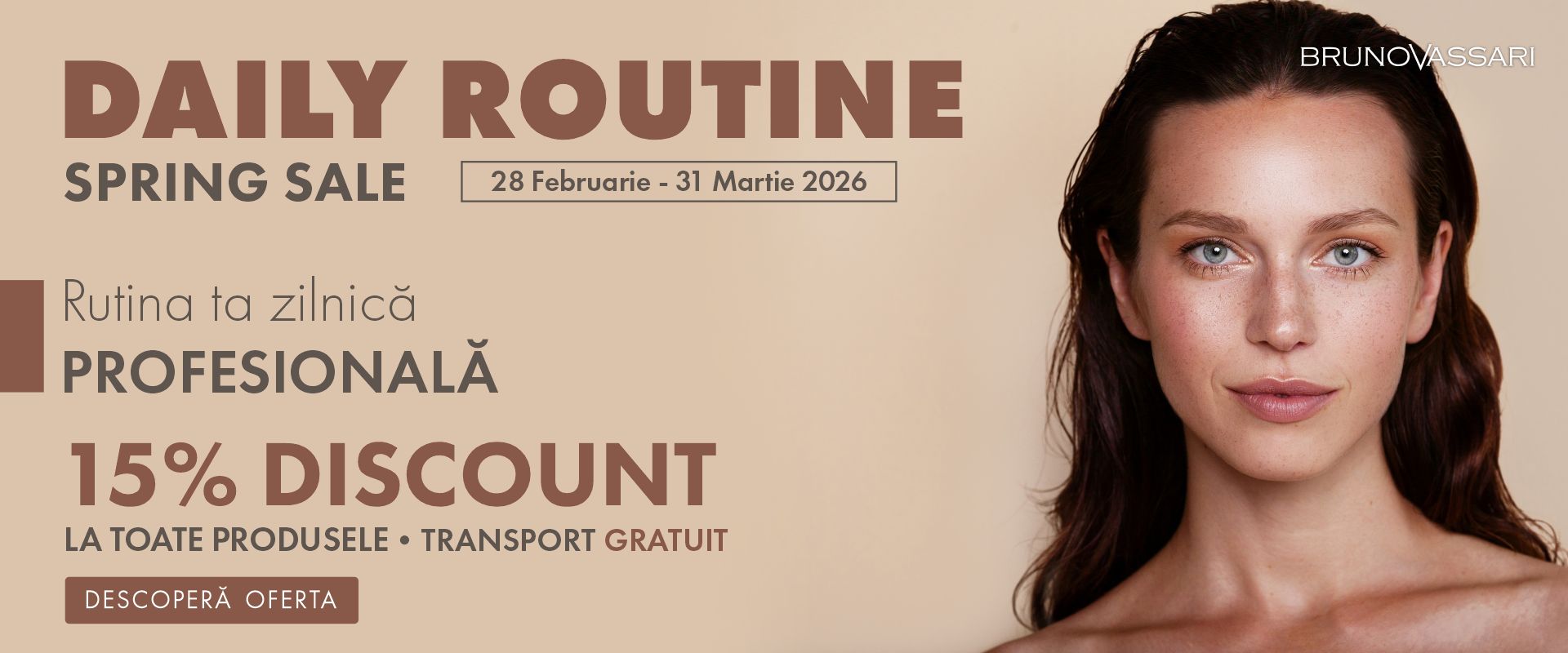 Daily Routine – Spring Sale 2026 îți aduce -15% DISCOUNT la toate produsele pentru îngrijire profesională a pielii. Creează-ți rutina zilnică ideală cu formule performante, iar beneficiezi de transport gratuit. Ofertă valabilă 28 februarie – 31 martie 2026, exclusiv pe brunovassari.ro.
